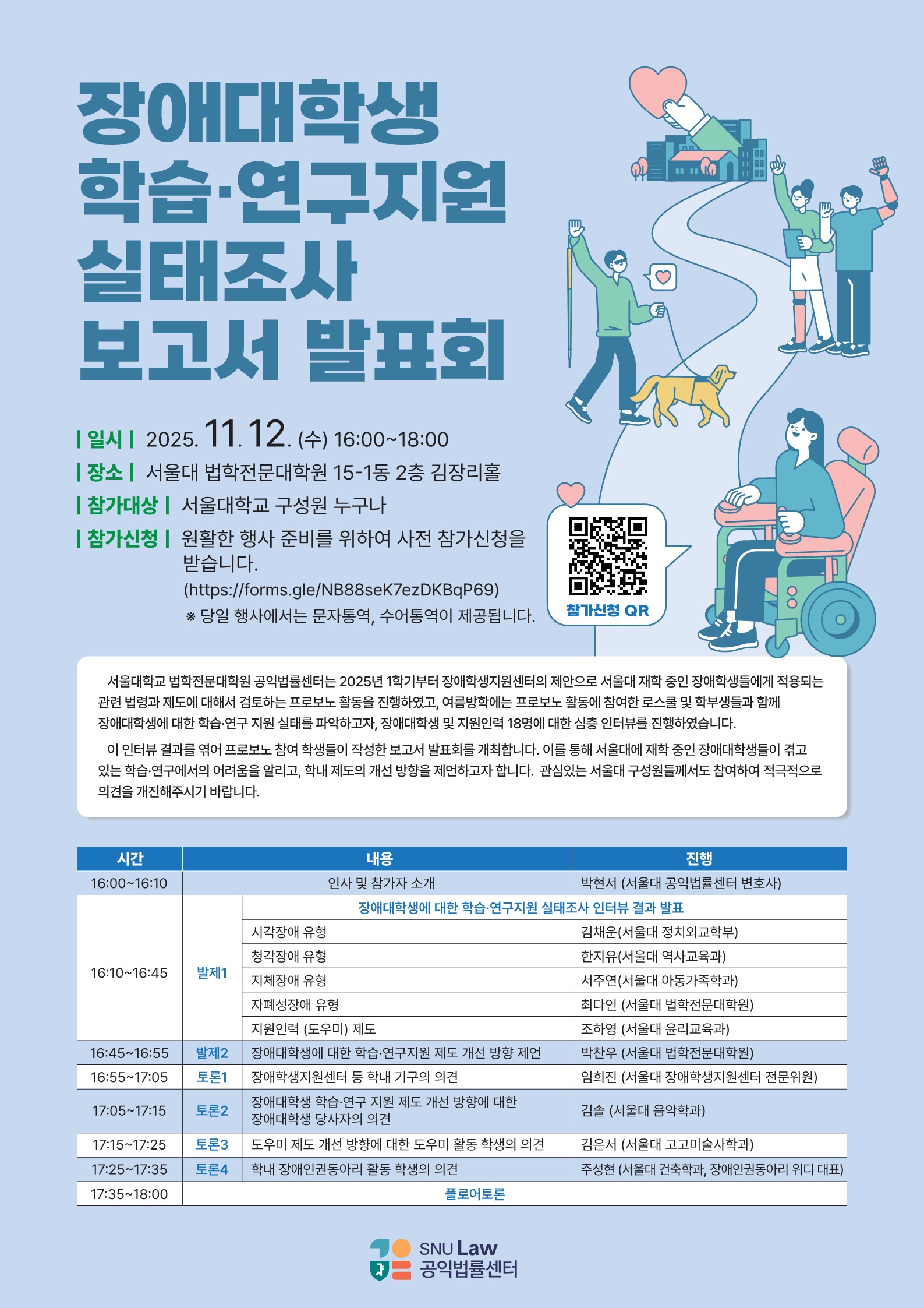 이 인터뷰 결과를 엮어 프로보노 참여 학생들이 작성한 보고서 발표회를 개최합니다. 이를 통해 서울대에 재학 중인 장애대학생들이 겪고있는 학습·연구에서의 어려움을 알리고, 학내 제도의 개선 방향을 제언하고자 합니다. 관심있는 서울대 구성원들께서도 참여하여 적극적으로 의견을 개진해 주시기 바랍니다.